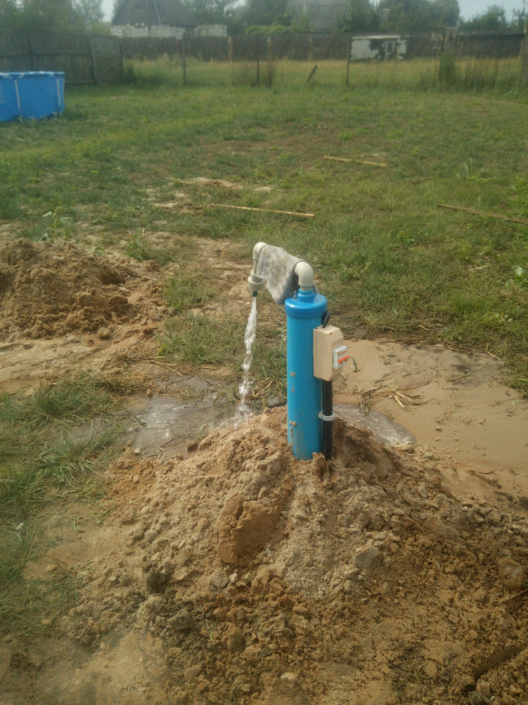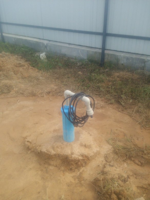 Скважина обсадной трубой 90мм, насос погружной установлен в скважину, на трубе крышка и патрубок, чтобы набрать воды в ведро, или подключить шланг на защелку-быстросьем. Также имеет провод с вилкой, для включеия насоса в розетку или удлинитель. Такая скважина всесезонна, можно в жару и мороз включить воду, набрать и выключить. Вода в подающем патрубке опускается, как правило ниже промерзания и не замерзает зимой.